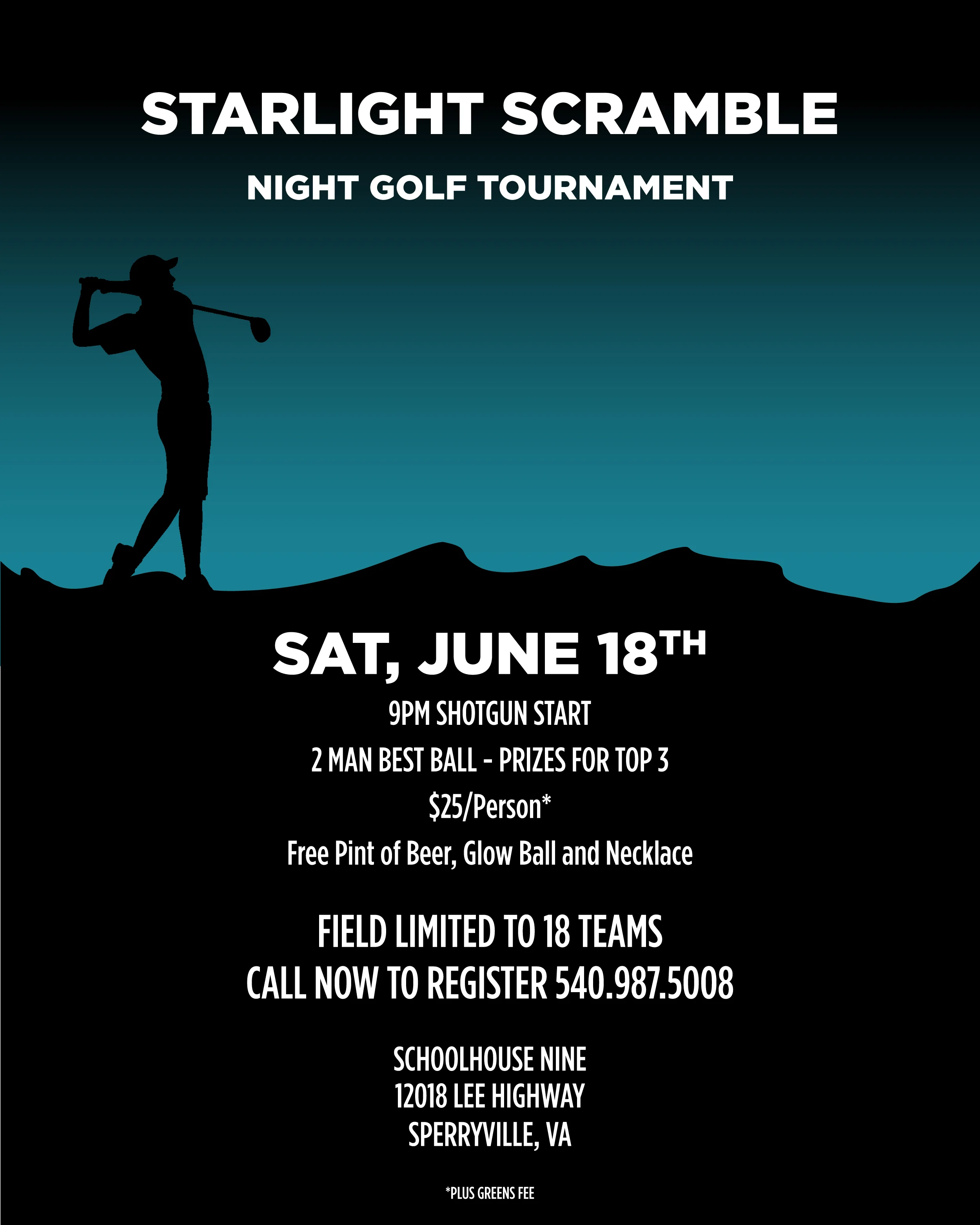 2 man teams with prizes awarded to the top 3. Shotgun start at 9PM. Field is limited to 18 teams.
